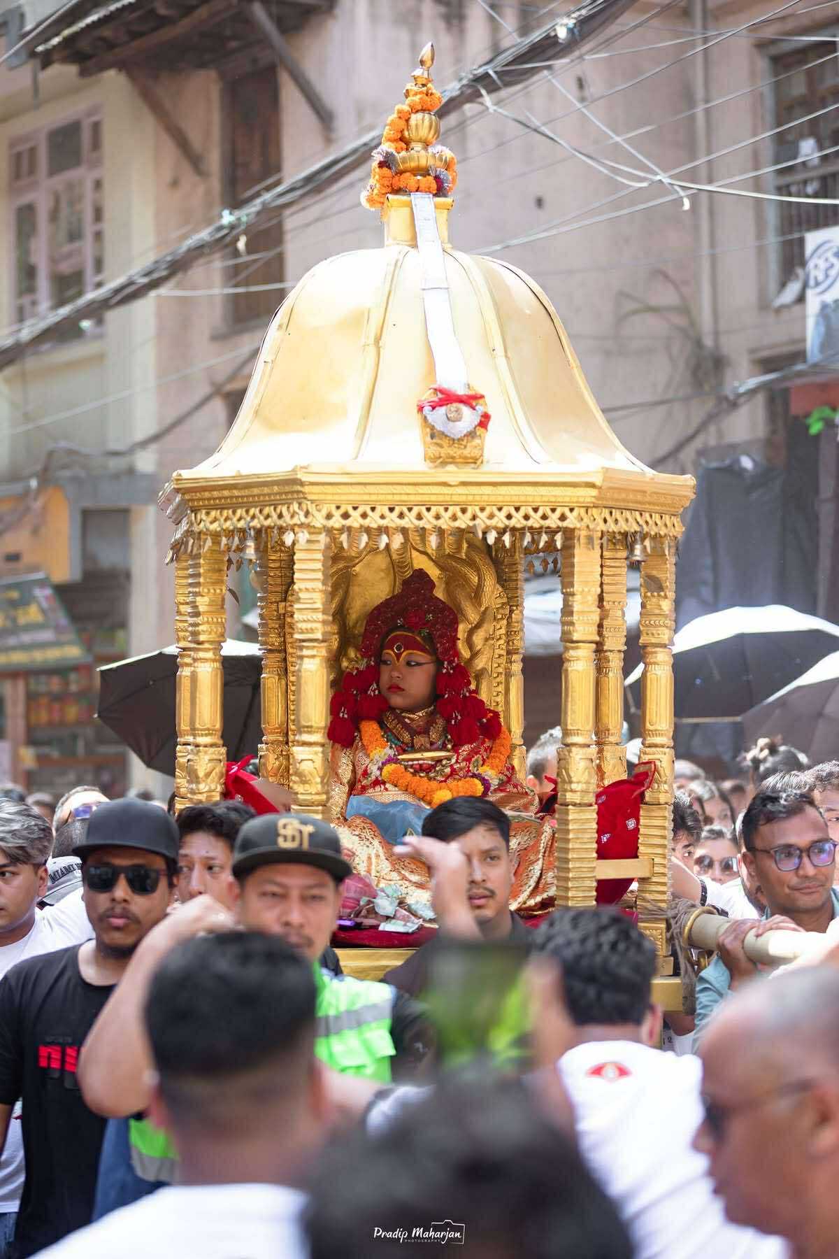 नेपाल प्रतिनिधि काठमाण्डौ । नवनियुक्त जीवित देवी कुमारी आर्यतारा शाक्य आज वसन्तपुरस्थित कुमारी घरमा भित्रिएकी छन् । योसँगै यसअघिकी कुमारी तृष्णा शाक्यलाई विधिवत् रूपमा बिदाइ गरिएको छ । करिब तीन वर्षकी आर्यतारा शाक्य असोज १४ गते मंगलबार काठमाण्डौको नयाँ ‘जीवित देवी’ कुमारीका रूपमा वसन्तपुरस्थित कुमारी घरमा भित्रिएकी छन् । उनी २०७९ पुस २६ गते जन्मिएकी हुन् । काठमाडौंका १८ महाविहारमध्ये शाक्य कूलको निर्धारित लक्षणयुक्त कन्यालाई विधिपूर्वक कुमारी बनाउने परम्परा लिच्छवि कालदेखि चलिआएको हो । कुमारी घरको निर्माण र रथ यात्राको थालनी भने करिब २ सय ७० वर्षअघि अन्तिम मल्लराजा जयप्रकाश मल्लको पालामा भएको हो ।